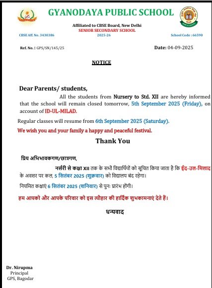 School will remain closed from 22nd sept 2025 to 10th Oct 2025